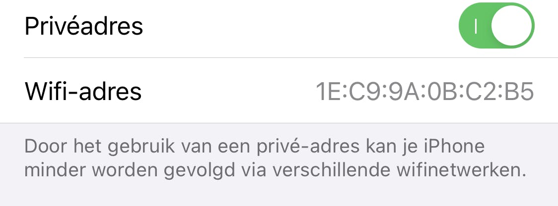 Om wifi-tracking te voorkomen kan je iPhone een willekeurig privéadres afgeven als je verbinding maakt met een openbaar wifi-netwerk. Dit vermindert (maar voorkomt niet!) de kans dat je telefoon wordt gevolgd via verschillende wifi-netwerken. Deze optie staat automatisch aan en kun je vinden onder Wifi in de Instellingen-app. Klik bij het betreffende wifi-netwerk op het informatie-icoontje (een ‘i’ in een rondje) en daar vind je de optie onder Privéadres.