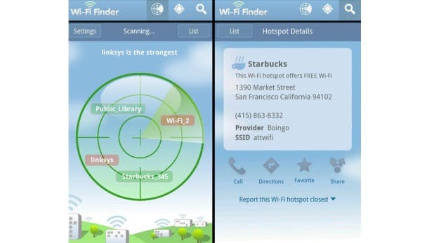 Gebruik in plaats daarvan een gratis wifi zoeker, zoals JiWire's Wi-Fi Finder. De app is beschikbaar voor Android en iOS en bevat een database met meer dan 550.000 Wi-Fi hotspots in 144 landen. Je kunt de frequent geüpdatete kaart met hotspots gebruiken in combinatie met de GPS-functie van je telefoon om de beste hotspot in je omgeving te vinden, of je kunt de database downloaden zodat je zelfs wanneer je offline bent een lijst met hotspots ter beschikking hebt. Wi-Fi Finder geeft details weer die je niet via het instellingenmenu van je telefoon kunt krijgen, zoals de aanbieder, het soort locatie (hotel, café, etc.), en of het om een gratis of betaalde hotspot gaat.