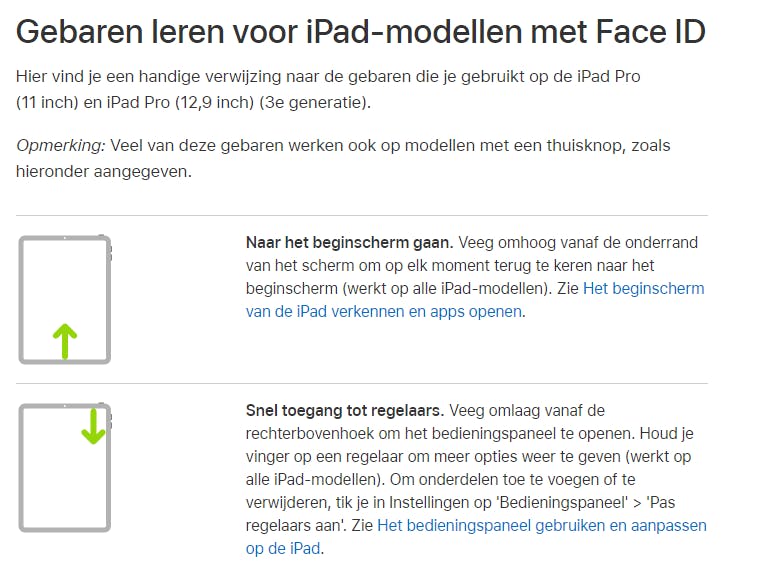 Met alleen de thuisknop en wat heen en weer swipen red je het niet meer, zeker niet als je de iPad wilt gebruiken om thuis te werken. Apple heeft met iPadOS de mogelijkheid toegevoegd om te multitasken door middel van handgebaren. Zo gebruik je (letterlijk in een handomdraai) verschillende apps tegelijk, schakel je snel tussen diverse apps en geef je de belangrijkste apps de meeste ruimte op je scherm. Op deze pagina worden het grootste deel van de handgebaren benoemd.