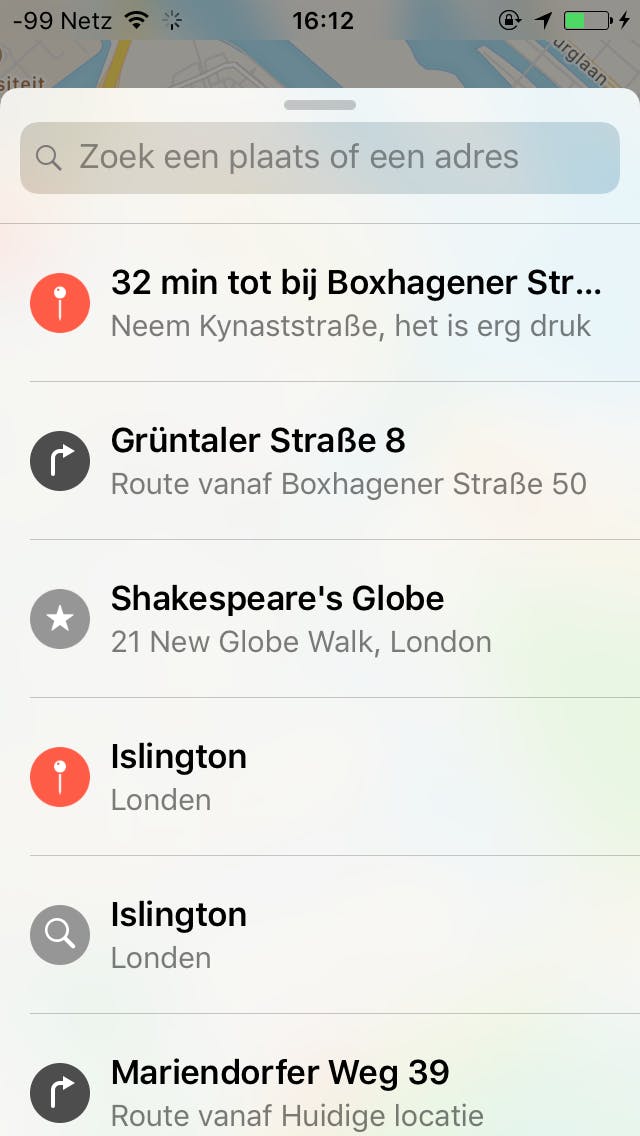 De Kaarten-app ziet er iets anders uit dan je gewend bent. Vanaf nu zitten alle navigatie-knoppen aan de onderkant. Wil je iets doen in de app, dan veeg je omhoog om alle opties in te zien. Hier vind je onder andere adressen die je de laatste tijd vaak hebt bezocht.