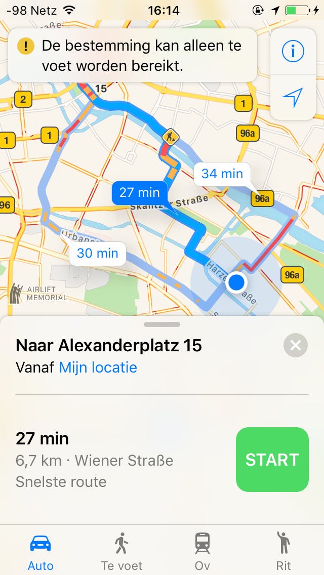 Wil je naar een adres navigeren, dan tik je gewoon op één van de adressen of typ een nieuw adres in de zoekbalk. Onderin kies je of je met de auto, te voet of met het openbaar vervoer wilt reizen. De grote groene startknop zorgt ervoor dat de navigatie begint.