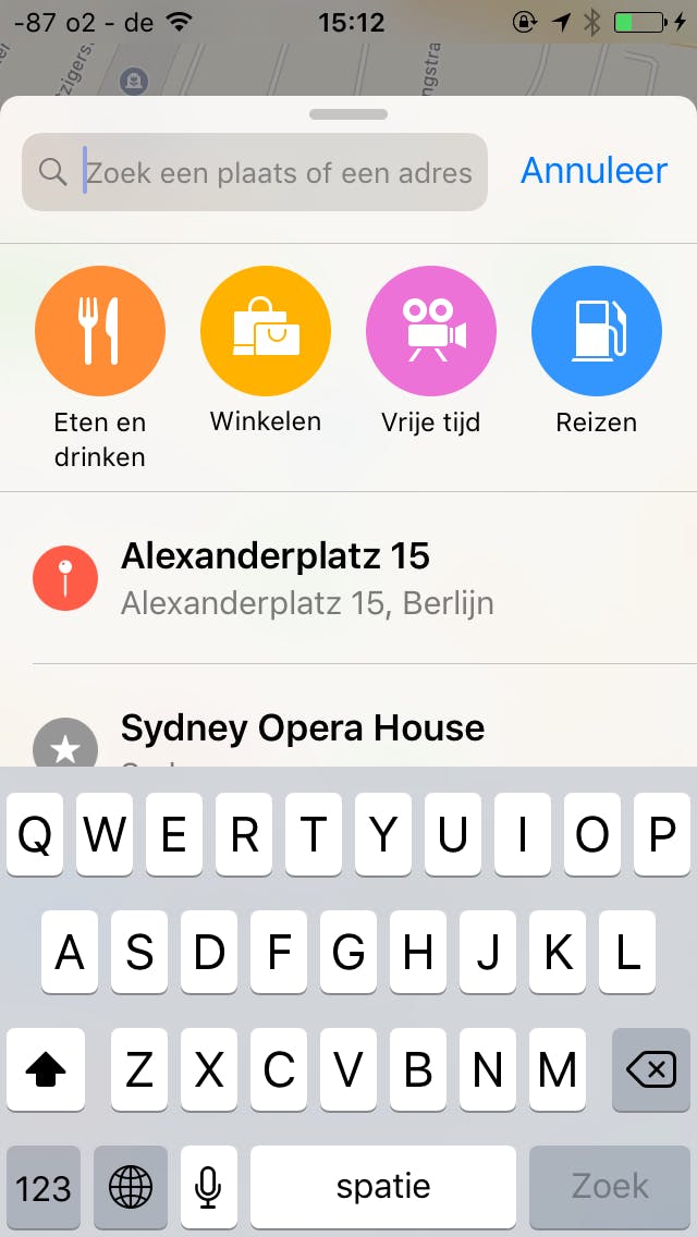 De zoekfunctie in de kaarten-app is een stuk handiger geworden. Als je in de zoekbalk tikt, verschijnen er vier ronde categorieën onder de zoek-balk: Eten en drinken, Winkelen, Vrije tijd en Reizen.