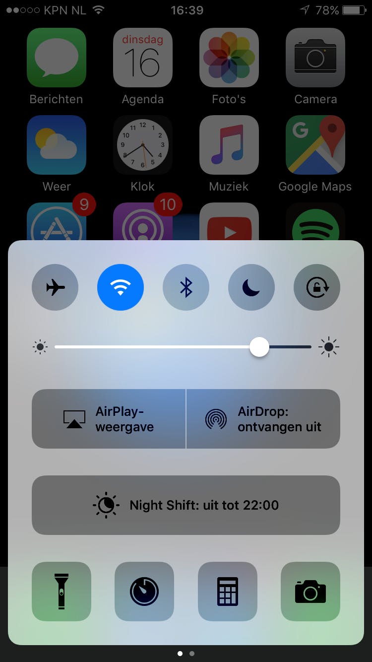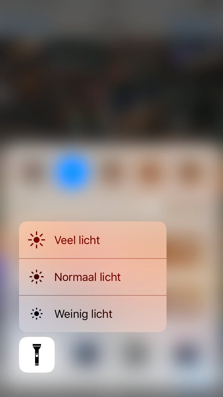 Als je van beneden naar boven veegt, open je het menu waar je de zaklamp aan en uit kunt zetten. Maar is het je al opgevallen dat het knopje op de zaklamp ook echt naar boven en beneden beweegt? Bonustip: Heb je een iPhone die 3D Touch ondersteunt? Dan kun je harder drukken op het scherm om drie helderheidsstanden te kiezen voor je zaklamp.