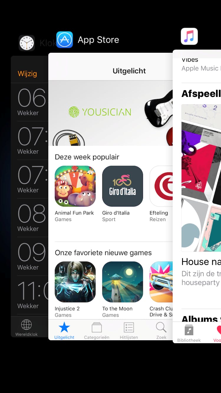 Je weet waarschijnlijk al dat je met een dubbele druk op de thuisknop je openstaande apps kunt zien. Dit is ook de plek waar je de apps kunt afsluiten door ze naar boven te vegen. Wist je dat je meerdere apps tegelijk kunt afsluiten? Veeg simpelweg met meerdere vingers over het scherm! Dat kan bijvoorbeeld met twee duimen, of met de wijs- en middelvinger van één hand.