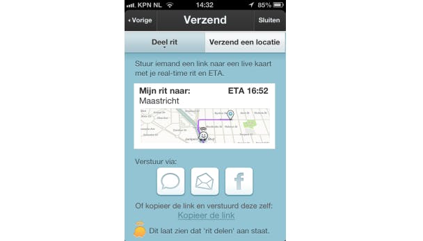 Wil je de route delen, bijvoorbeeld met degene waarnaar je op weg bent, tik dan nadat de route is berekend, op Delen en geef aan hoe je een link naar de live kaart wilt versturen. Op de live kaart is exact te zien waar je bent en wanneer je naar verwachting aankomt. Het ontvangstcomité kan dan alvast voor je klaarstaan met koffie of een broodje.