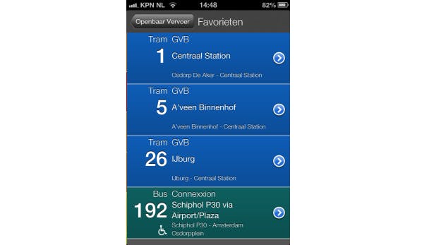 Sommige vervoersmaatschappijen hebben erg veel lijnen. Gelukkig kan een lijn via de zoekfunctie snel uit de lange lijst worden gepikt. Verder is het aan te bevelen om de door jou veelgebruikte lijnen te markeren als favoriet. Ze komen dan netjes bij elkaar onder het kopje Favorieten op het hoofdscherm te staan. Met een bus- of tramlijn kun je eigenlijk altijd in twee richtingen reizen.