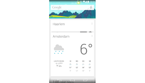 Je merkt ook dat Google zijn eigen diensten een prominentere plek heeft gegeven. Google Now is de opvallendste. Google Now geeft naast een zoekmachine ook relevante informatie op basis van bijvoorbeeld je locatie, agenda, tijdstip, et cetera. Denk hierbij bijvoorbeeld aan weerinformatie, de reistijd naar huis, valuta en toeristische trekpleisters in de buurt.