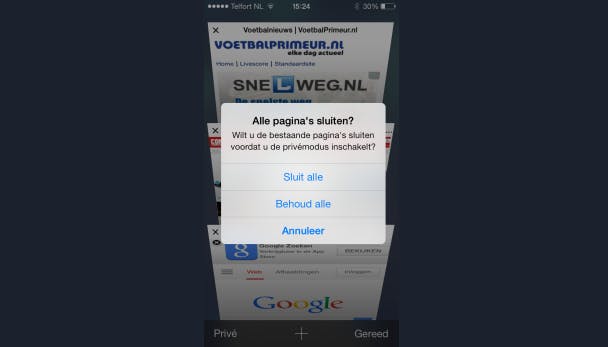 In iOS 7 start je vanuit Safari rechtstreeks een privésessie, zodat je iPhone geen surfgegevens bewaart. Denk hierbij aan bezochte websites, wachtwoorden en cookies. Open in de browser de tabbladweergave via het pictogram rechtsonder het scherm (twee vierkantjes). Tik rechtsonder Privé aan. Je merkt nu aan de grijze balken dat de privémodus is ingeschakeld.