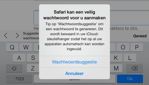 Wanneer je bij een webdienst een nieuw account creëert, genereer je vanuit Safari automatisch een sterk wachtwoord. Hiervoor schakel je eerst de iCloud Sleutelhanger in (zie vorige tip). Surf met Safari naar een leuke webdienst en maak een nieuw account aan. Tik in het wachtwoordveld en kies voor Wachtwoordsuggestie / Gebruik wachtwoordsuggestie. Omdat iCloud Sleutelhanger de gegevens bewaart, hoef je moeilijke wachtwoorden niet zelf te onthouden.