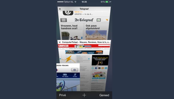 Apple heeft de tabbladfunctie in Safari gewijzigd, waardoor je beter door openstaande websites bladert. Bijkomend voordeel hiervan is dat je webpagina's een stuk vlotter afsluit. Start Safari op en open rechtsonder de tabbladweergave (twee vierkantjes). Druk op een webpagina en veeg naar links om het tabblad af te sluiten. Als alternatief gebruik je eventueel het kruisje.