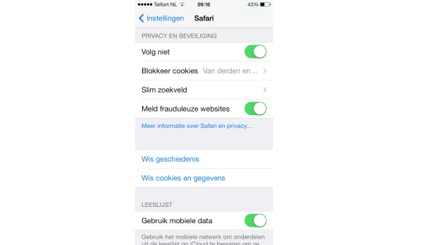 Vanuit Safari verzend je automatisch verzoeken naar webbeheerders om je surfgedrag niet te monitoren. Ga naar Instellingen / Safari en activeer Volg niet. Vooral online advertentiebureaus proberen via tracking cookies bezochte websites aan een persoon te koppelen. Zij doen dat onder meer om persoonsgerichte advertenties voor te schotelen. Na het inschakelen van de functie zullen sommige webbeheerders het verzoek respecteren.