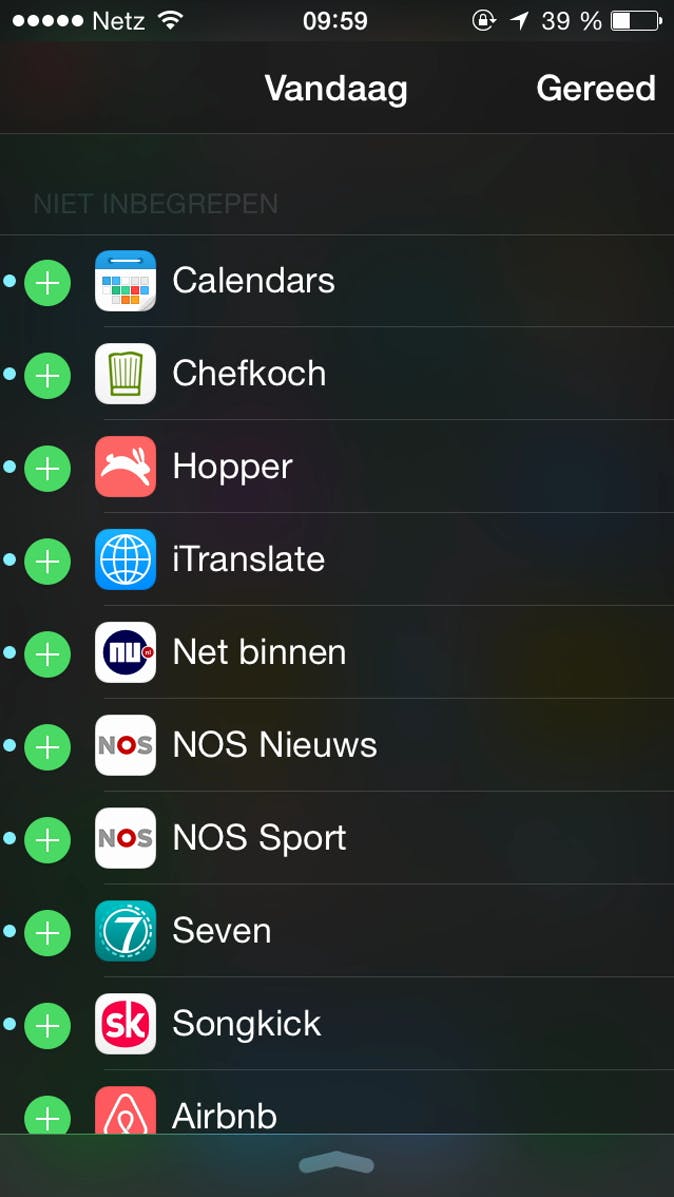Wil je een widget aan je berichtencentrum toevoegen, tik dan op het groene plusje voor de naam van de app. Om een widget te verwijderen uit het berichtencentrum tik je logischerwijs op het rode minnetje.