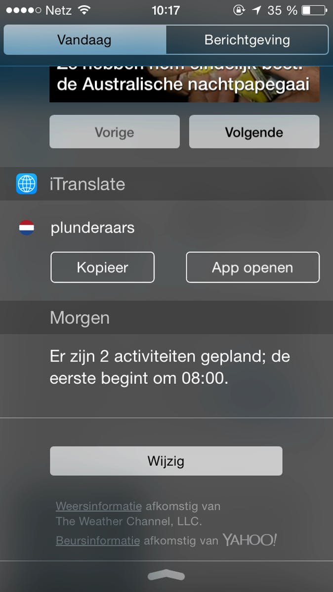 Als je nu ergens op je iPhone een woord vindt dat je niet begrijpt, tik je erop en kies je voor Kopieer. Ga naar het berichtencentrum en tik onder iTranslate op Klembord vertalen, de widget analyseert zelf wat de brontaal is en geeft de Nederlandse vertaling weer.