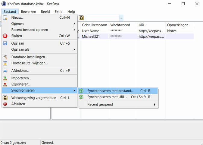 KeePass kan synchroniseren met een ander bestand of via een weblink.