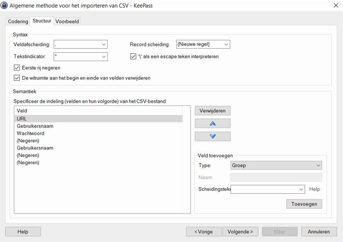Met KeePass kun je zelf de structuur van het te importeren CSV-bestand instellen.
