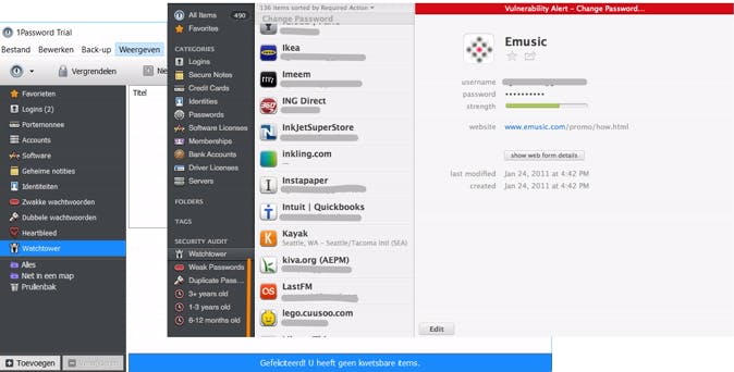 Alle diensten, behalve KeePass, hebben de optie om je wachtwoorden en websites te analyseren. Voor LastPass geef je dan eenmalig toestemming om je kluis te openen en te analyseren. Vervolgens wordt aangegeven op welke websites je je wachtwoord moet wijzigen, omdat die websites bijvoorbeeld gehackt zijn. Bovendien geeft het weer op welke websites je zwakke wachtwoorden gebruikt, dezelfde wachtwoorden en te oude wachtwoorden. Dashlane en 1Password doen dat iets beter en geven je continu weer welke wachtwoorden zwak, dubbel of gehackt zijn. Bij 1Password moet je die functie wel even zelf inschakelen, via Weergeven / Watchtower. Met LastPass en Dashlane is het mogelijk om bij een aantal websites de wachtwoorden direct vanuit de wachtwoordmanager te wijzigen, zonder dat je zelf hoeft in te loggen.