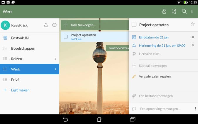 Thuis en op het werk zijn er onvoorstelbaar veel taken en klusjes die gedaan moeten worden. Door de overvloed aan activiteiten dreigen we het overzicht te verliezen. Want wat pak je het eerst aan en hoe breng je structuur aan in je werkzaamheden? Met de gratis app Wunderlist breng je alles wat je moet doen onder in overzichtelijke takenlijsten. Dat schept al direct meer duidelijkheid. Is een taak groot of complex? Dan deel je hem op in subtaken, zodat je niet tegen die grote berg aan blijft hikken. Elke subtaak mag ook weer uit meerdere subtaken bestaan als dat het duidelijker maakt. Aan elke taak of subtaak kun je vervolgens een einddatum, alarm, notitie en enkele opmerkingen of bestanden koppelen. Alles wat je nodig hebt staat dus overzichtelijk bij elkaar en je weet altijd wat je wanneer te doen staat. Nu hoef je deze taken alleen nog maar uit te voeren en af te vinken. Zo ga je als een speer. Wunderlist kun je ook als programma op je pc installeren.
