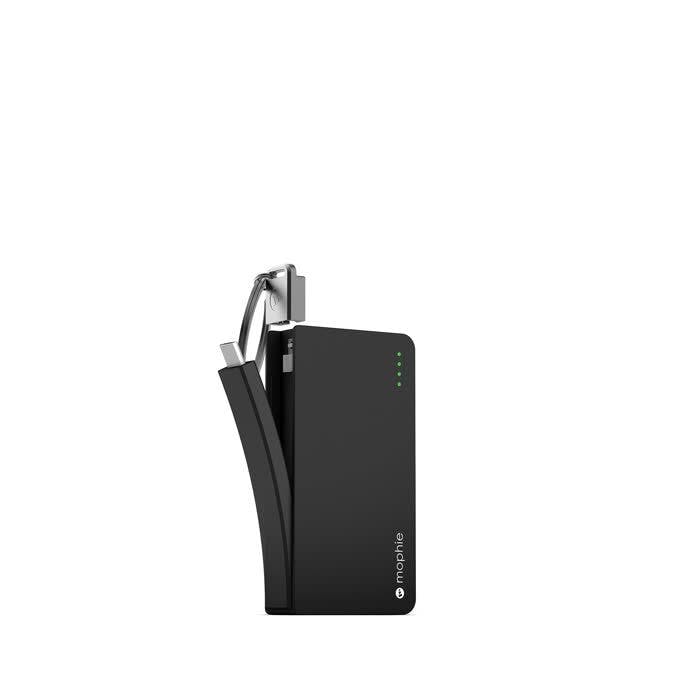 Zoals eerder gezegd bestaan er ook piepkleine powerbanks. Deze mophie power reserve is er eentje in sleutelhangerformaat. De compacte powerbank is voorzien van een geïntegreerde micro-usb- of Lightning-kabel en heeft een capaciteit van 1.350 mAh. Dankzij de vier ledlampjes kun je op elk ogenblik aflezen hoeveel energie er nog overblijft. Het lichtgewicht weegt amper 56 gram en is beschikbaar in zwart, wit en rood.