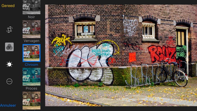 Tik je op het pictogram van een vierkant met drie bolletjes, dan verschijnt een setje kant-en-klare filters. Hiermee geef je de foto vlotjes een andere uitstraling. Tik net zolang tot je een mooi exemplaar te pakken hebt, of kies Geen om het filter weer uit te schakelen als er niets naar jouw smaak tussen zit.
