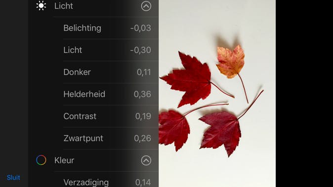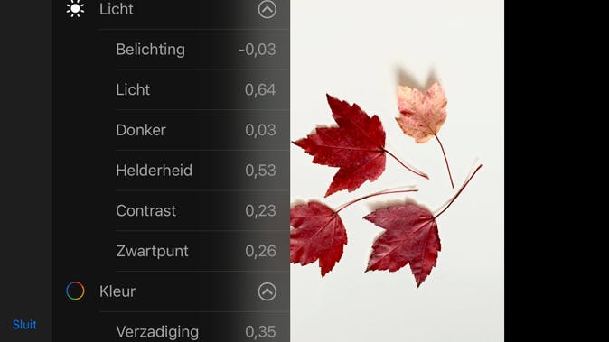 De gereedschappen met de meeste mogelijkheden tref je aan onder het pictogram van een ouderwetse draaiknop. Er staan dan drie groepen met bewerkingen tot je beschikking, te weten Licht, Kleur en Z/w (zwart/wit). Zodra je een groep aantikt, krijg je een soort filmstrip te zien die als een gewone schuifregelaar werkt. Veeg er met een vinger over om de foto lichter of donkerder te maken, meer of minder kleur te geven, of om het mooiste zwart-wit-effect te kiezen. Wil je terug naar de originele staat? Veeg dan tot het puntje naast de filmstrip netjes op de rode horizontale lijn valt. Dat is zeg maar de nulstand van de schuifregelaar.