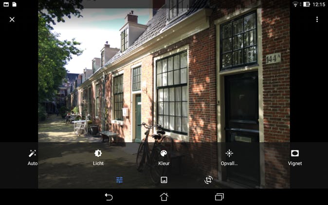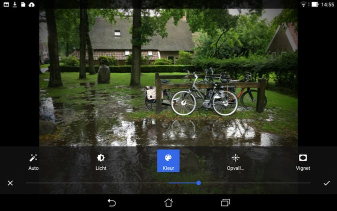 Tik in de onderste werkbalk op het pictogram waarop schuifjes staan en tik vervolgens op de toverstaf om de foto automatisch te optimaliseren. Tik op Terug als de bewerking tegenvalt. Tik op Licht om een foto lichter dan wel donkerder maken en op Kleur om de kleuren meer of minder verzadigd te maken. Met Opvallen verhoog of verlaag je het algehele contrast in de foto. Tot slot kun je met Vignet de hoeken van de foto een tikkeltje donkerder maken, zodat je de aandacht van de kijker naar het midden van de foto stuurt.