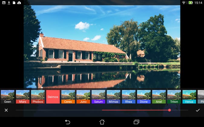 Ben je gecharmeerd van filters? Ook deze app heeft er diverse van aan boord, dus je kunt je lekker uitleven. Filters zijn een laagdrempelige manier om je foto's snel een leuke uitstraling te geven, zonder dat jij je hoeft te verdiepen in allerlei ingewikkelde fotobewerkingstechnieken. Tik in de onderste werkbalk op het middelste pictogram (vierkant met een berglandschap), waarna een ruime selectie filters verschijnt. Tik ze gerust stuk voor stuk aan, tot je een effect tegenkomt dat goed past bij de foto die je op dit moment bewerkt. Om te voorkomen dat foto's te veel op elkaar gaan lijken, hebben de filters een schuifbalk waarmee je het effect kunt bijstellen. Valt het tegen en gebruik je deze foto toch liever zonder filter? Kies dan voor het effect genaamd Geen.