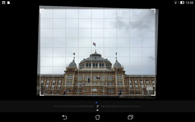 Het derde en laatste pictogram (uitsnedegereedschap met twee boogvormige pijlen ernaast) is een stuk interessanter. Dit gebruik je weer om een scheve foto recht te zetten, of een rechte foto juist expres scheef te zetten als dat mooier staat. Veeg over de schuifregelaar om de gewenste hoek in de stellen. Het pictogram achter de schuifbalk stelt je in staat een foto in stappen van negentig graden te roteren. Handig om bijvoorbeeld een foto netjes rechtop te zetten als de oriëntatiesensor van jouw tablet of smartphone dat niet automatisch heeft gedaan. Je kunt ook links van de schuifregelaar op Auto tikken. Dan probeert de app om jouw foto automatisch recht te zetten en uit te snijden. Bewerkingen die je met de app Foto's doet, kun je helaas niet meer terugdraaien zodra je een foto opslaat. Wel wordt de bewerkte foto als een nieuw bestand opgeslagen, dus ook het origineel blijft bewaard.