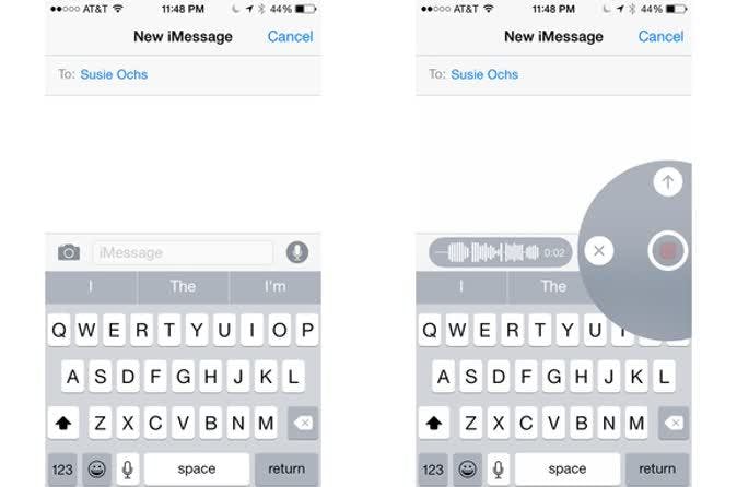 Als bonus heeft de Berichten-app iOS 8 twee microfoonknoppen. De rechthoekige witte microfoonknop links van de spatiebalk zet zoals gewoonlijk je woorden om in tekst. Maar als je met een andere iMessages-gebruiker communiceert, kun je de grijze ronde microfoonknop (rechts van het tekstvak) indrukken om een gesproken bericht op te nemen dat als audio verstuurd wordt. Je hoeft niet te typen, en je vriend(in) krijgt de vrolijkheid, droefheid, of tweeslachtigheid in je stem te horen. Het is leuk.