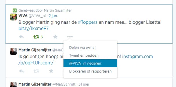 Plaatst die ene gebruiker nét iets teveel commerciële tweets, maar vind je het wat ver gaan om die persoon te ontvolgen (al was het alleen maar omdat het een zakencontact is). Gelukkig is er nu een tussenweg, je kunt namelijk de tweets van deze persoon uitschakelen. Je doet dit door te klikken op de drie puntjes bij het bericht van de persoon die je wilt negeren en vervolgens klik je op Negeren.