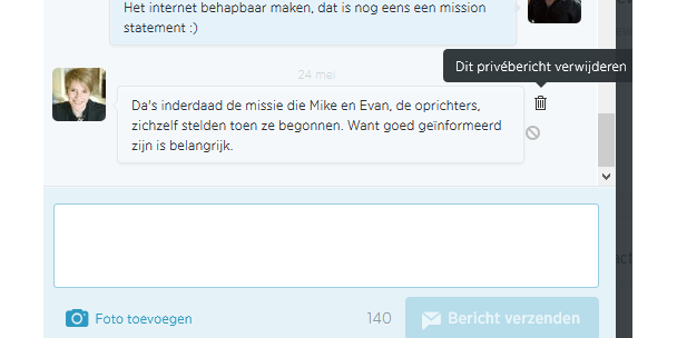 Heb je een privébericht gestuurd naar iemand en heb je daar een beetje spijt van? Dan heb je een groot probleem, toch? Zeker niet! Het is namelijk gewoon mogelijk om berichten te ontsturen. Wanneer je in Twitter klikt op het overzicht met privéberichten (envelopje rechtsboven) en vervolgens op de prullenbak, is het bericht niet alleen in je eigen overzicht verdwenen, maar ook in dat van de persoon aan wie je hem hebt gestuurd. Crisis opgelost.