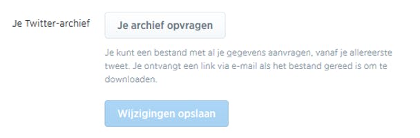 Tot slot is het fijn om te weten dat je al je gegevens van Twitter kunt downloaden. Fijn als je een archiefje wilt aanleggen, of wilt stoppen met Twitter, maar je berichten niet kwijt wilt. Je downloadt je archief door te klikken op Instellingen rechtsboven en vervolgens op Je archief opvragen. Je krijgt dan een link van Twitter zodra het archief is gegenereerd en vervolgens heb je alle tweets die je ooit hebt verzonden in eigen beheer.
