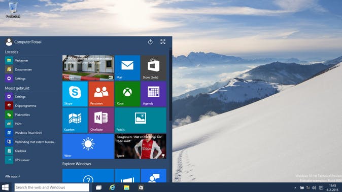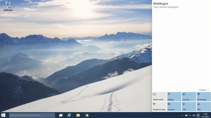 Na de installatie van Windows 10 merk je dat er het één en ander is veranderd. Natuurlijk als je Windows 8.1 gewend bent, maar ook als je al eerder hebt gewerkt met de vorige uitprobeerversie van Windows 10. De standaard-bureaubladachtergrond zal wintersportliefhebbers aanspreken, naast de startknop is een zoekveld verschenen en in het systeemvak vind je een spraakballon-icoontje. Dit icoontje opent het notificatievenster aan de rechterkant van het scherm, waar we straks op terugkomen.