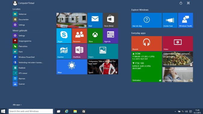 Het startmenu is wederom flink onder handen genomen. Wanneer je op de startknop drukt krijg je een menu dat een kruisbestuiving is van het bekritiseerde startscherm uit Windows 8 en het vertrouwde startmenu van Windows 7 en eerder. Links zie je snelkoppelingen naar toepassingen en Windows verkenner-locaties. Rechts staan dynamische tegeltjes die aan een app gekoppeld zijn. Deze tegels kun je zelf indelen, grootte bepalen en aangeven hoe groot het tegeloppervlak moet zijn. Als de tegels nog steeds te rommelig zijn voor je smaak, dan kun je ze ook gewoon allemaal verwijderen.