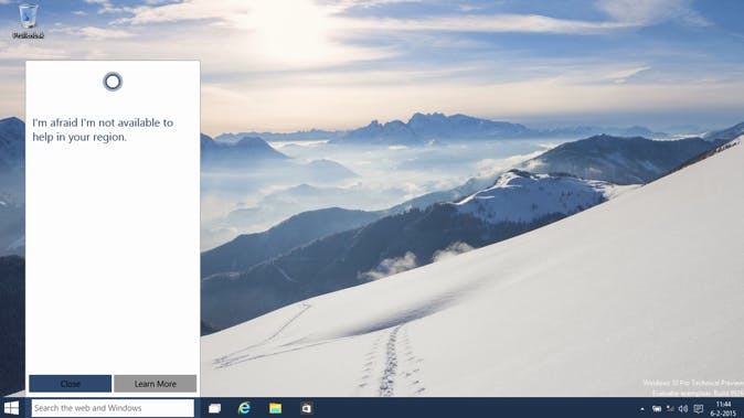 Dit zoekvenster is tevens de plek om de spraakbesturing van Cortana in te raadplegen. Ook hier worden we teleurgesteld: Cortana is niet beschikbaar in Nederland. Ook in het Engels mogen we geen spraakopdrachten geven. Jammer, want dit hadden we graag in de praktijk eens willen testen. De combinatie van verplichte Bing en een afwezige Cortana maken het zoekveld vooralsnog een teleurstelling in deze uitprobeerversie