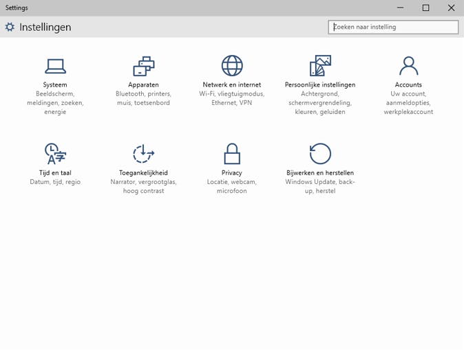 Over de instellingen gesproken. Hier zijn we bijzonder positief over! In Windows 8 waren de instellingen onderverdeeld in het configuratiescherm en in de tegeltjesinterface. Wat erg frustrerend werkte, instellingen waren lastig te vinden en je schakelde regelmatig onverwacht tussen de instellingenvensters. In deze nieuwe Windows 10-versie zijn de twee instellingenmenu's samengevoegd tot één overzichtelijk venster. Alles is overzichtelijk onderverdeeld in categorieën, en in tegenstelling tot het configuratiescherm is het aantal categorieën ook beperkt. Negen in totaal. Fijn en overzichtelijk. We hopen dat Microsoft ook eigenschap-instellingen, zoals die van de taakbalk, startmenu en Deze Computer in de instellingen integreert.