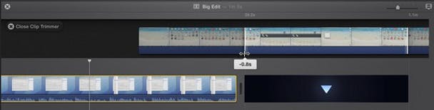 Zoals je geleerd hebt, kun je binnen de tijdlijn de onderste hoeken van een clip verslepen om de clip te verkorten of te verlengen (in het laatste geval werkt dat alleen als je niet al met de volledige clip aan de gang bent). Dit is een prima manier om clips bij te snijden, maar je tast in zekere zin in het duister: Je kunt niet zien wat er aan de clip voorafgaat of wat erop volgt. En daarom is de Clip Trimmer een handige tool.