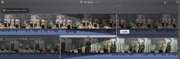 Terwijl de Clip Trimmer het begin en einde van een clip in de tijdlijn aanpakt, is de Precision Editor ervoor om te bepalen hoe twee clips in elkaar overgaan. Je kunt met deze tool gebruiken om een transitie te verplaatsen of langer of korter te maken, een nieuw bewerkingspunt te kiezen, of een audiotrack langer te maken.