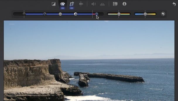 Color correction: De kleurcorrectie pas je aan door middel van drie schuifbalken. De eerste is om de helderheid en het contrast aan te passen. Er zijn vijf besturingselementen, van links naar rechts Adjust Shadows, Adjust Contrast, Adjust Brightness, een tweede versie van Adjust Contrast, en Adjust Highlights. De presentatie van deze tools is niet erg intuïtief, maar als je in iPhoto het Adjust paneel gebruikt hebt zul je het snel onder de knie krijgen.