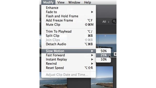 Om de snelheid van een clip aan te passen, selecteer deze in de tijdlijn. In het Modify menu kun je Slow Motion, Fast Forward, Instant Replay, Rewind, en Reset Speed commando's vinden.
