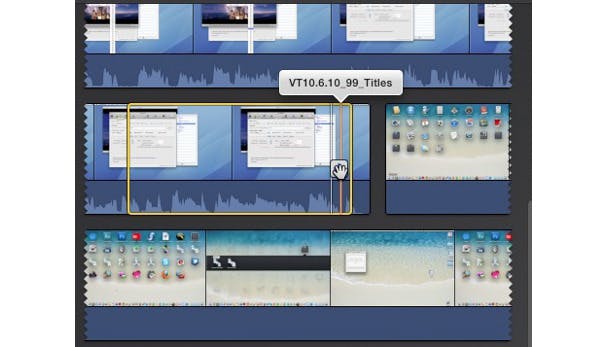 Audio verkorten of verlengen: Stel dat je een clip in de tijdlijn hebt die audio bevat. Stel verder dat je wilt dat de audio van die clip langer blijft spelen dat de video van de bewerkte clip - je wilt bijvoorbeeld dat het over het begin van de volgende clip blijft spelen. Je kunt dit doen door de audiotrack van de video te scheiden. Kies Modify > Detach Audio (Command-Option-B). Als je audio van video scheidt kun je de clips los van elkaar bewerken, om bijvoorbeeld een kuch in de audiotrack weg te halen.