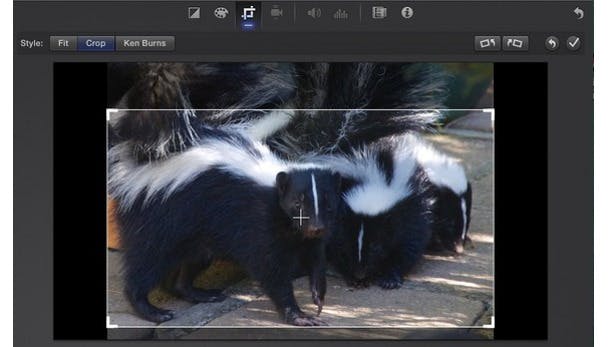 Wanneer je dit doet en de clip afspeelt, zul je zien dat het programma een Ken Burns pan-en-scan effect heeft toegevoegd. Zelf heb ik dit effect al veel te vaak gezien. Je kunt het verwijderen door op de afbeelding te dubbelklikken, op de Crop tool die in het Viewer paneel verschijnt te klikken en op de Fit knop in de linkerbovenhoek van de afbeelding te klikken. Of je kunt op Crop klikken en het gedeelte van de afbeelding kiezen dat je in de filmpje wilt hebben. (Let op: Het bijsnijden is wordt beperkt door de beeldverhouding van de frame van je filmpje - 16:9 voor filmpjes die afkomstig zijn van HD clips, bijvoorbeeld.)