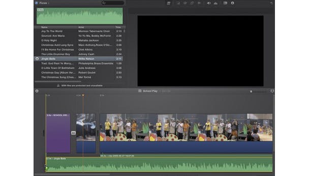 Als je liever een audio clip ergens anders vandaan haalt dan je iTunes library, dan kan dat ook. Versleep het bestand gewoon van de Finder in deze muziektrack, en het wordt toegevoegd. Let op: Als je muziek van iemand anders gebruikt en het vervolgens uploadt naar een site als YouTube of Vimeo, dan kun je binnen de kortste keren een waarschuwing verwachten, en zul je je video moeten verwijderen.