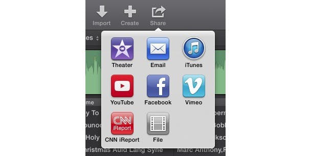 Klik erop om je keuzes te zien te krijgen: Theater, Email, iTunes, YouTube, Facebook, Vimeo, CNN iReport, en File. Hieronder een korte bespreking van elke optie.