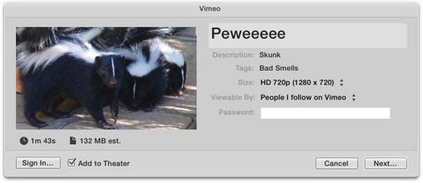 YouTube, Facebook, Vimeo, en CNN iReport: Ik heb besloten om deze diensten samen te voegen omdat ze op een vergelijkbare manier werken. Om je werk te uploaden moet je bij de gekozen dienst een account hebben. Zodra je die account hebt aangemaakt op de site van de dienst kun je deze selecteren in het Share menu. Klik in het volgende venster op de knop Sign In. Er wordt dan om je gebruikersnaam of e-mailadres en wachtwoord gevraagd. Elke dienst stelt je in staat om te kiezen wie je geüploade video kan bekijken - alleen jijzelf en je vrienden maar niet het algemene publiek, bijvoorbeeld. Verder werkt het bijna hetzelfde als de andere opties die ik al besproken hebt. Je kunt het formaat kiezen en de Description en Tags velden aanpassen en de lengte en de geschatte grootte van het filmpje zien.