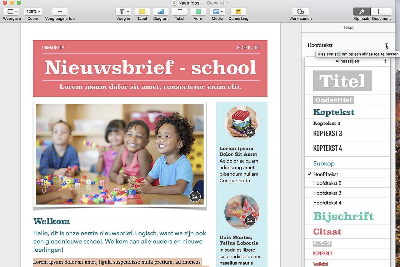 Je ziet direct waartoe Pages in staat is. Een strak vormgegeven voorbeeld van de beoogde nieuwsbrief verschijnt. Jij hoeft alleen de voorgebakken teksten nog aan te passen. Ook de afbeeldingen zijn naar wens aanpasbaar. Klik simpelweg op een tekstblok en doe je ding. Om een afbeelding aan te passen klik je op het symbooltje rechtsonder bij zo'n afbeelding, en kies je vervolgens iets uit je eigen fotocollectie. Rechts van het document zie je de opmaakmogelijkheden, inclusief stijlen. Een overzicht van de beschikbare stijlen zie je door op het naar beneden gerichte driehoekje achter- in dit geval - Hoofdtekst te kiezen. Het aantal beschikbare stijlen verschilt per sjabloon. Maak gebruik van stijlen om een consistent ogend document te maken.