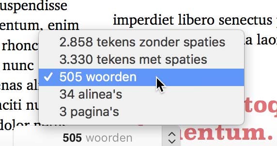 Vaak moet een werkstuk, artikel of boek voldoen aan een (maximaal of minimaal) aantal woorden. Tik in de menubalk van Pages in het menu Weergave op Toon aantal woorden. Door op de pijltjes rechts van het woordtelblokje onderaan de pagina te klikken kan je ook zaken als aantal pagina's enzovoorts kiezen. Zo weet je precies waar je aan toe bent; de teller loopt live mee.