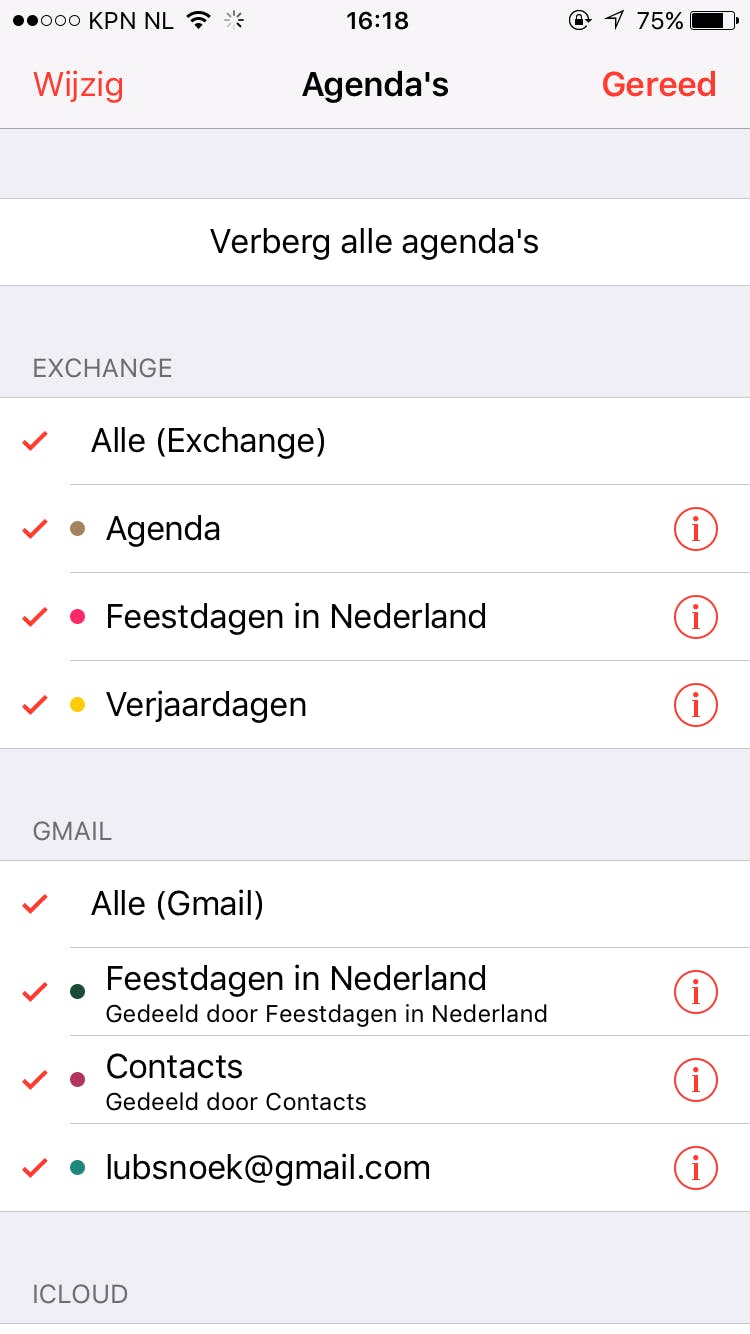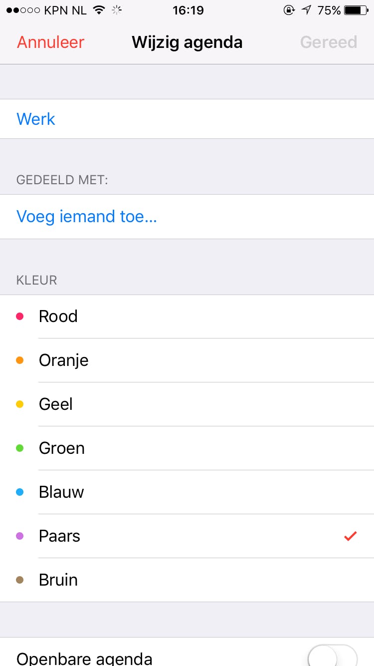 Om een agenda te delen in iOS, moet je de Agenda app openen en op Agenda's drukken. Navigeer naar de agenda die je wilt delen, en druk op het i icoon rechts van de agenda. Selecteer Voeg persoon toe... Je kunt nu de naam van de contactpersoon in je Contacten intypen, of je kunt een nieuw e-mailadres toevoegen.