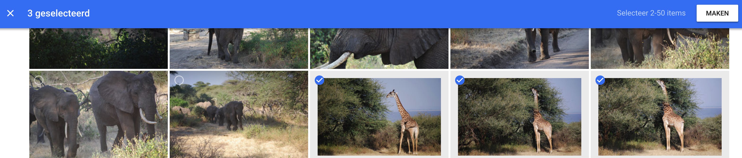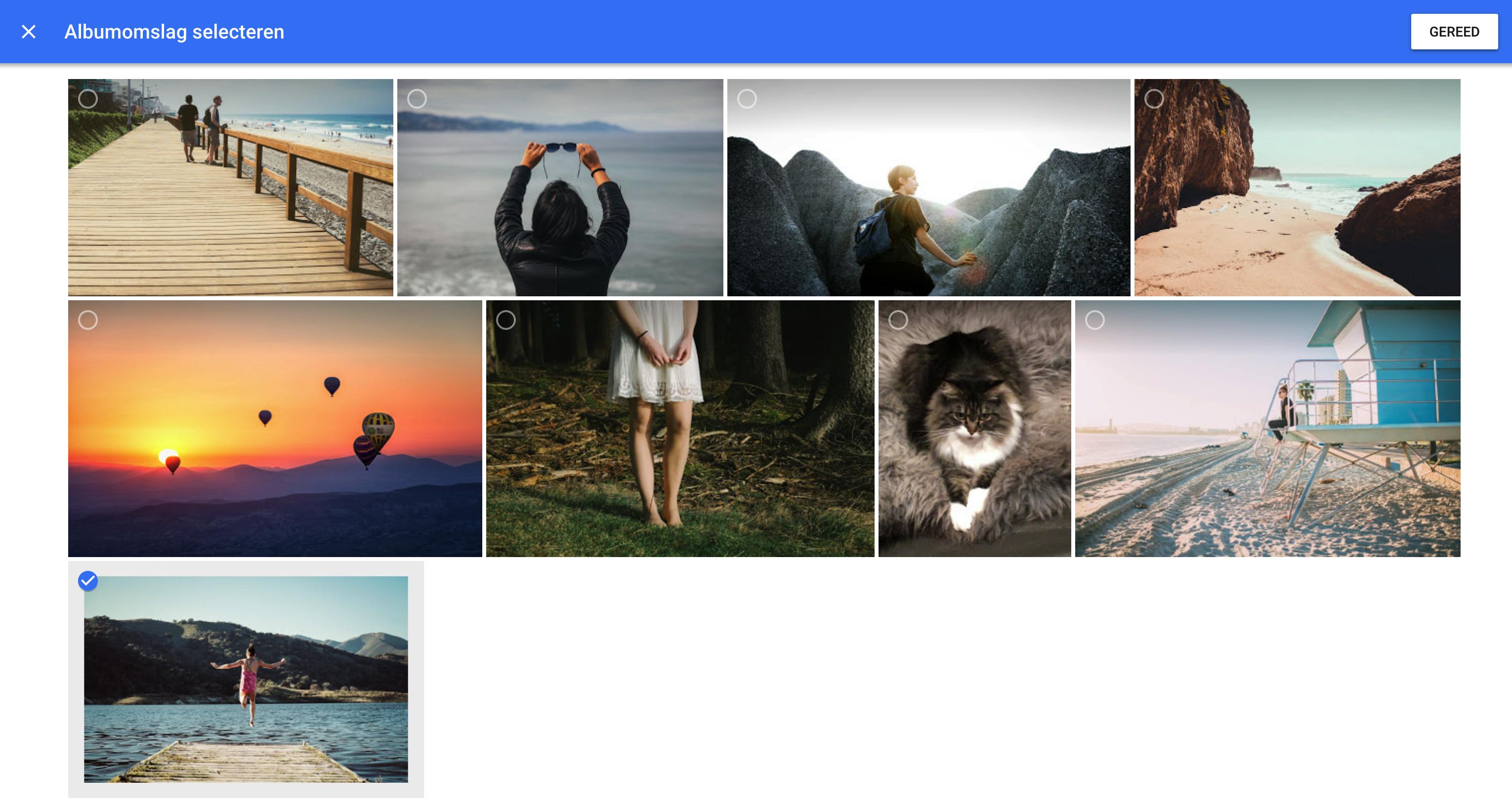 Zijn al je foto’s geüpload naar de cloud, dan kun je ze organiseren in albums. In de web-app ga je naar Albums en klik je op Nieuw album. Je ziet dan een overzicht van alle foto’s die in Google Foto’s staan. Kies de afbeeldingen die je wilt bundelen in het album, klik op Maken en geef het nieuwe album een naam. Klink linksboven op het vinkje om het album te bewaren. Om het album een coverfoto te geven, klik je rechtsboven op de drie puntjes en daarna op Albumomslag instellen. Een miniatuurweergave van de foto’s in je album verschijnt en je kunt een vinkje zetten bij de foto die je als cover wilt gebruiken.