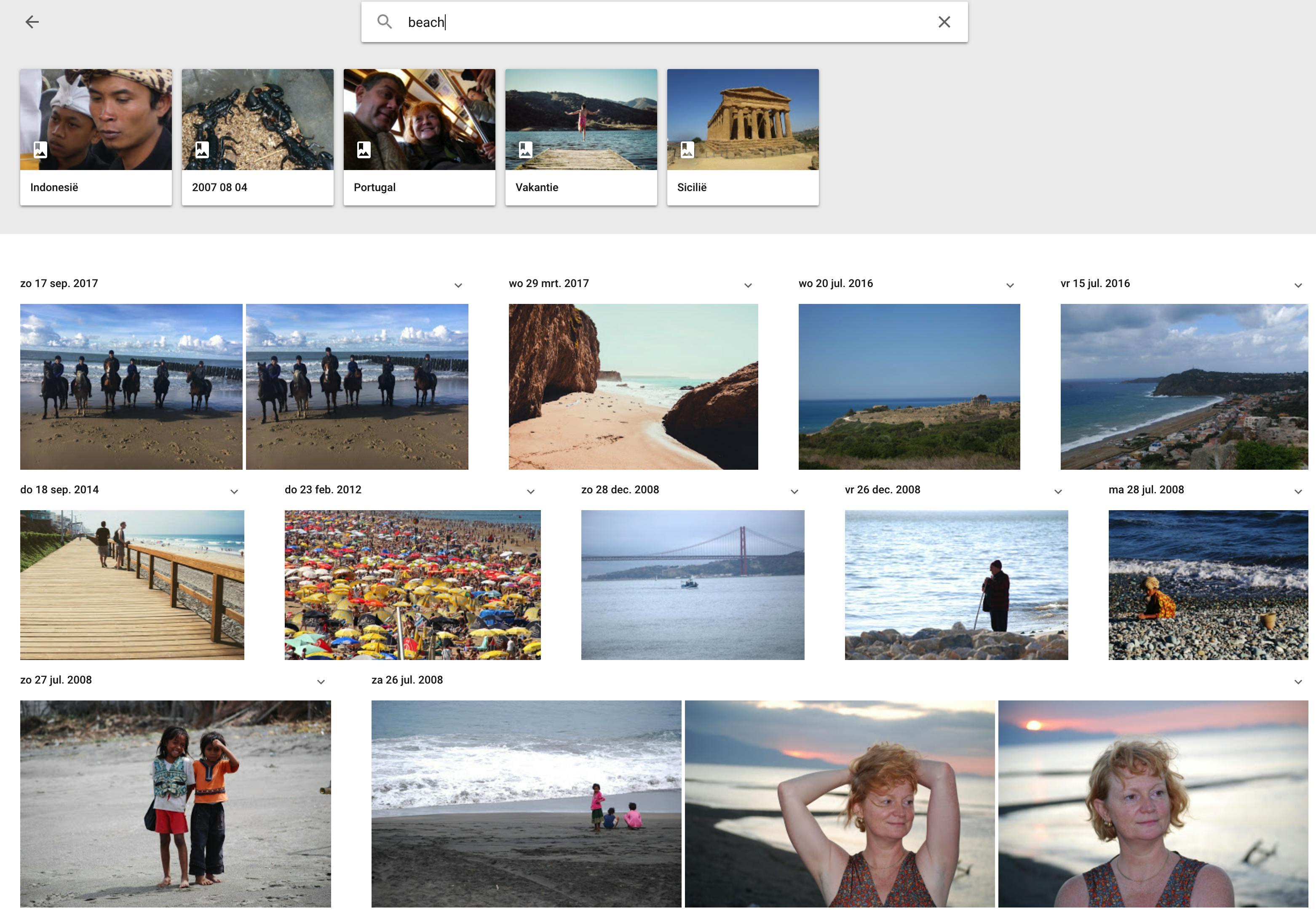 Een van de sterkste punten van Google Foto’s is autotagging. Zonder dat je zelf ook maar één tag hebt toegevoegd, herkent de toepassing zelfstandig objecten, locaties, dieren en situaties. Dat wordt duidelijk wanneer je op Albums klikt. Google heeft zelf al groepen samengesteld, zoals Plaatsen, Dingen, Video’s en Collages. Open je bijvoorbeeld de groep Dingen, dan zie je zelfs dat Google allemaal subgroepen aangemaakt heeft. Zo bestaat er bij ons zelfs een groep Ranch. We kunnen ons echter niet herinneren dat we ooit op een ranch zijn geweest, tot we de groep openen … En inderdaad, ooit hebben we paardgereden bij een boerderij. Verder kun je die autotagging ook gebruiken in zoekopdrachten, zelfs met ietwat ongewone zoektermen als smoking, kerk of shopping.