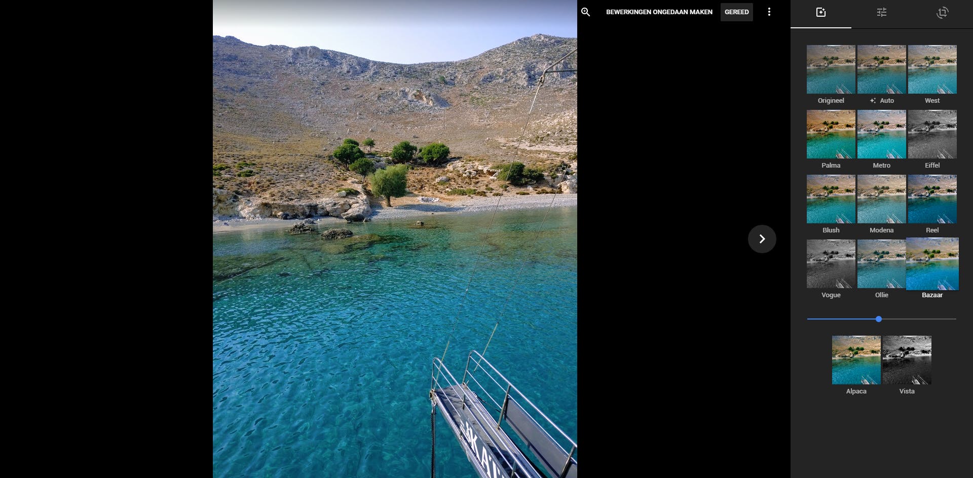 Zitten er een paar foto’s tussen die wel een eenvoudige retouchering kunnen gebruiken, dan heb je daar geen extern programma meer voor nodig. Open een foto en klik rechtsboven op de knop die eruitziet als drie kleine schuifregelaars. In de editor vind je onder meer een tool om de afbeelding te roteren en uit te snijden. Met de drie schuifregelaars corrigeer je de helderheid, kleur en scherpte. De eerste twee schuifregelaars kun je nog verder openklappen in een hele reeks subregelaars. Verder beschikt de editor ook over een stel kant-en-klare filters, waaronder een auto-correctiefilter en een schuifje om de intensiteit van het filter te regelen. Door op de bewerkte foto te klikken en de muisknop ingedrukt te houden, vergelijk je de originele afbeelding met jouw bewerkingen.